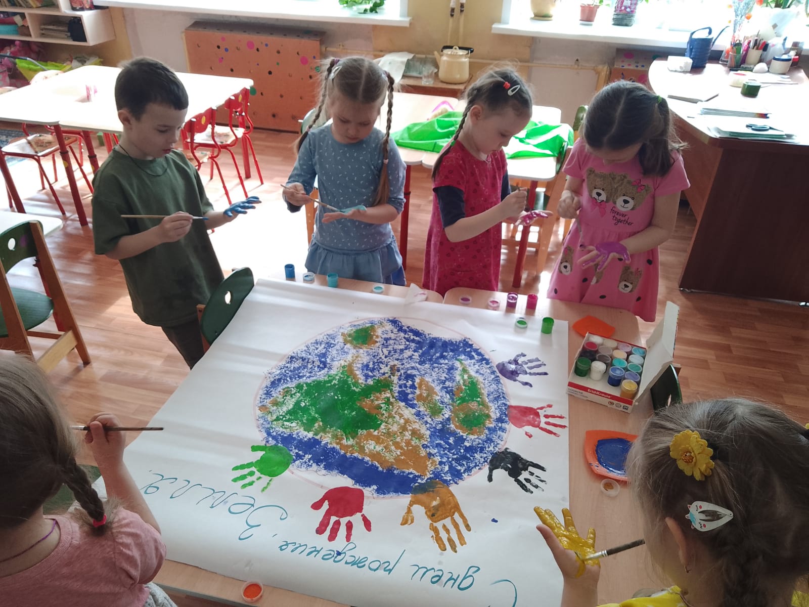 Дети рассмотрели иллюстрации «Земля – это наш дом и мы должны его беречь», где наглядно могли увидеть как красива наша планета, животный и растительный мир, счастливые лица людей. Дошколята узнали, почему гибнет все живое и как люди могут помочь сохранить красоту Земли. Вместе с детьми вспомнили «Правила поведения на природе», рассматривали глобус, сделали коллективную работу «Берегите нашу Землю» и нарисовали нашу зелёную планету. Этот день помог детям открыть новые знания и приобрести понимание бережного и созидательного отношения к окружающему миру и планете Земля.