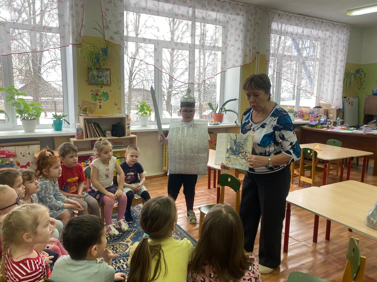 Во все времена у нашей Родины - великой России были свои защитники. И об этом пошла речь в нашем детском саду, где тематическая неделя "Богатыри земли русской"(10-14 февраля) помогла ребятам познакомиться с историей древней Руси, с ее надежной защитой - героическими образами былинных богатырей: Ильей Муромцем, Добрыней Никитичем, Алешей Поповичем. Какими были первые защитники Руси, почему о них складывали былины, сказания, дошедшие до наших дней, какими были их доспехи, оружие? Всю неделю образовательная и самостоятельная деятельность детей были в той или иной степени связаны с русскими богатырями их ратными битвами. Дети вместе с воспитателями .(беседы) "Путешествовали по русской земле", "Древним городам России (стольный Киев-Град, Чернигов, Муром)", рассматривали картины В. Васнецова "Три богатыря","Витязь на распутье", "Битва на Калиновом мосту", К. Васильева "Настасия Микулишна", делились своими впечатлениями об увиденном .