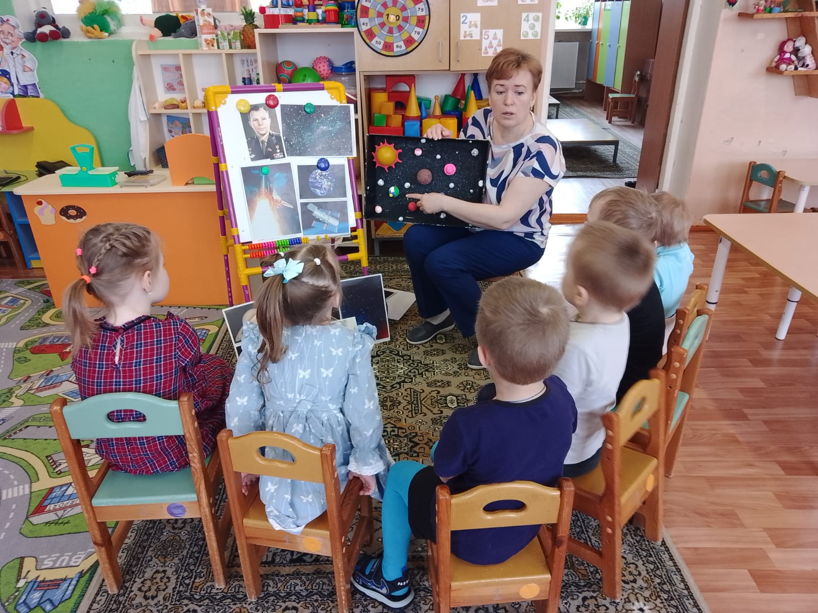 Детям рассказали о том, почему именно 12 апреля считается Днём космонавтики, и о том, что Юрий Гагарин стал первым человеком, совершившим полёт вокруг Земли. Кроме того, малыши узнали о Белке и Стрелке, первых животных, побывавших в космосе, и посмотрели мультфильм об их приключениях.